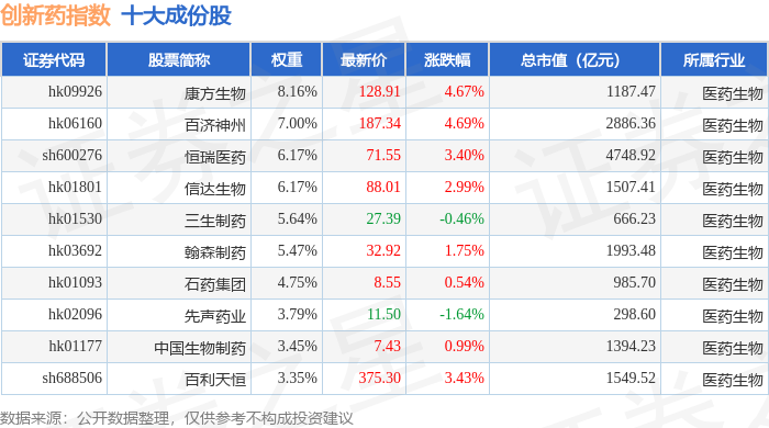 证券之星消息,9月30日,创新药(980086)指数报收于2853.69点,涨2.39%,成交258.94亿元。当日该指数成份股中,上涨的有50家,再鼎医药以7.15%的涨幅领涨,下跌的有7家,三生国健以1.97%的跌幅领跌。