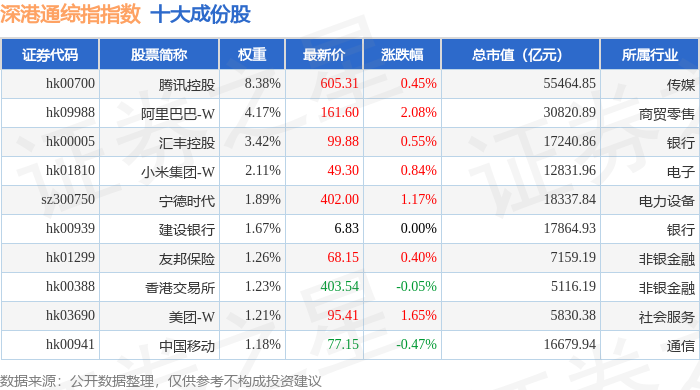 深港通综指(983005)指数十大成份股详情如下:
