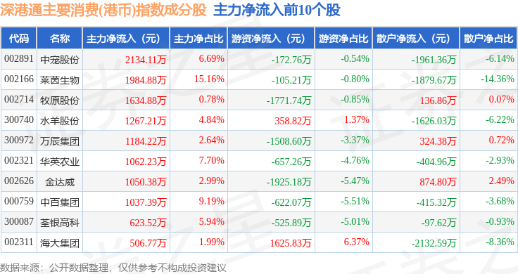 资金流向方面,深港通主要消费(港币)(983022)指数成份股当日主力资金净流出合计9.92亿元,游资资金净流入合计2.31亿元,散户资金净流入合计7.61亿元。成份股资金流向详情见下表: