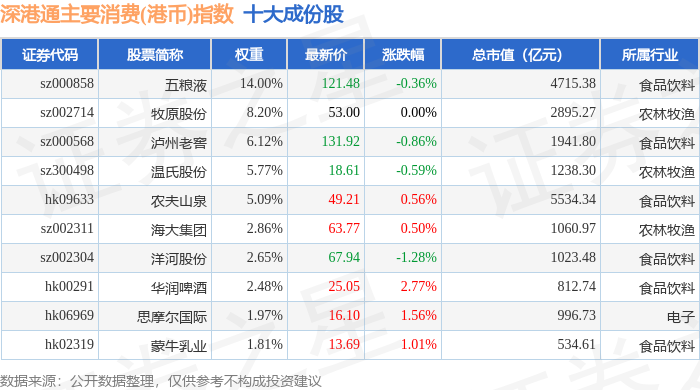 深港通主要消费(港币)(983022)指数十大成份股详情如下: