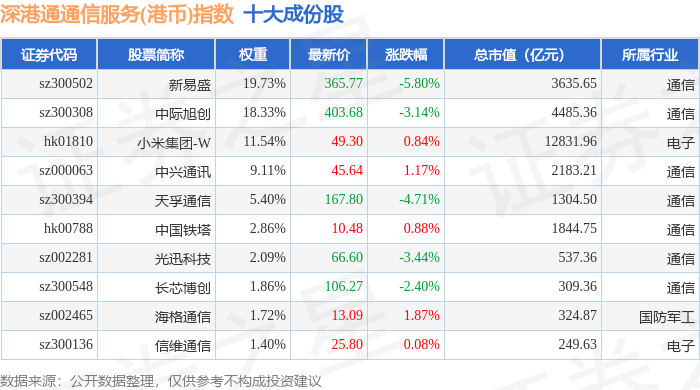 深港通通信服务(港币)(983034)指数十大成份股详情如下: