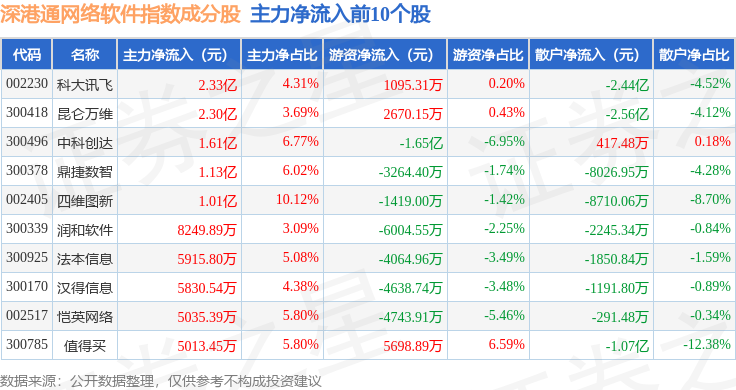 资金流向方面,深港通网络软件(983047)指数成份股当日主力资金净流出合计13.92亿元,游资资金净流入合计2.52亿元,散户资金净流入合计11.4亿元。成份股资金流向详情见下表: