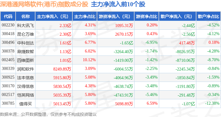 资金流向方面,深港通网络软件(港币)(983048)指数成份股当日主力资金净流出合计13.92亿元,游资资金净流入合计2.52亿元,散户资金净流入合计11.4亿元。成份股资金流向详情见下表: