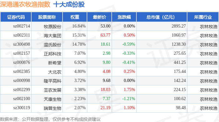深港通农牧渔(983051)指数十大成份股详情如下: