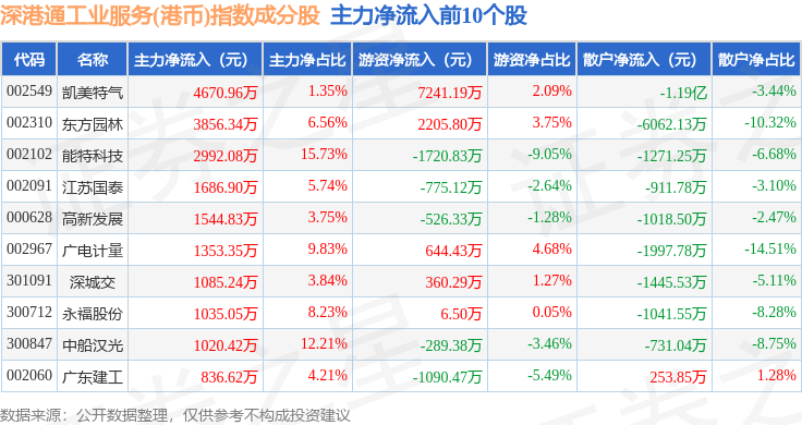 资金流向方面,深港通工业服务(港币)(983056)指数成份股当日主力资金净流出合计10.73亿元,游资资金净流入合计4.58亿元,散户资金净流入合计6.14亿元。成份股资金流向详情见下表: