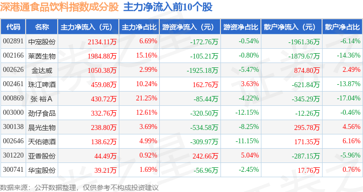 资金流向方面,深港通食品饮料(983065)指数成份股当日主力资金净流出合计7.81亿元,游资资金净流入合计1.7亿元,散户资金净流入合计6.11亿元。成份股资金流向详情见下表: