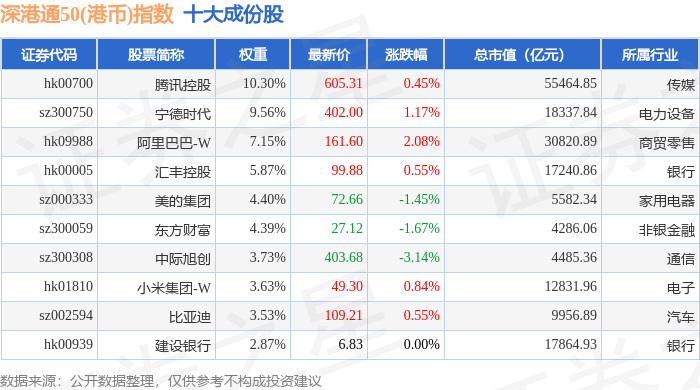 深港通50(港币)(983092)指数十大成份股详情如下: