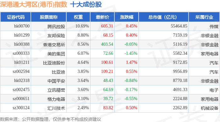 深港通大湾区(港币)(983090)指数十大成份股详情如下: