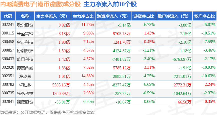 资金流向方面,内地消费电子(港币)(983106)指数成份股当日主力资金净流出合计46.52亿元,游资资金净流入合计18.34亿元,散户资金净流入合计28.18亿元。成份股资金流向详情见下表: