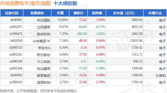 内地消费电子(港币)(983106)指数十大成份股详情如下: