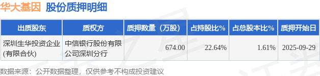 证券之星消息,华大基因(300676)9月30日公开信息显示,股东深圳生华投资企业(有限合伙)向中信银行股份有限公司深圳分行合计质押674.0万股,占总股本1.61%。质押详情见下表: