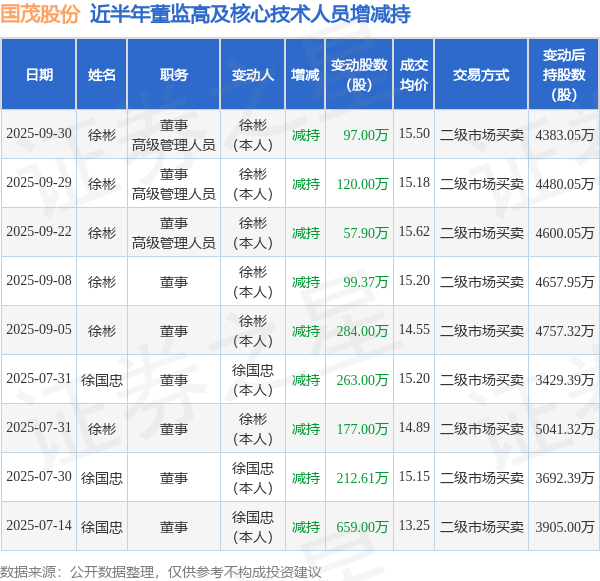 证券之星消息,根据9月30日市场公开信息、上市公司公告及交易所披露数据整理,国茂股份(603915)最新董监高及相关人员股份变动情况:2025年9月30日公司董事,高级管理人员徐彬共减持公司股份97.0万股,占公司总股本为0.1477%。变动期间公司股价下跌1.1%,9月30日当日收盘报17.03元。
