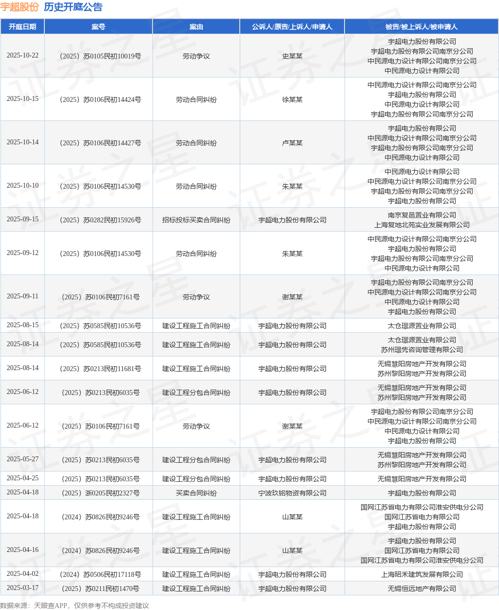 案号:(2025)苏0106民初14530号根据统计,近一年内以宇超电力股份有限公司为当事人的历史开庭公告有19则,其中案由为“建设工程施工合同纠纷”的公告以7则居首,其次为“劳动合同纠纷”有4则,“劳动争议”有3则。历史开庭公告如下: