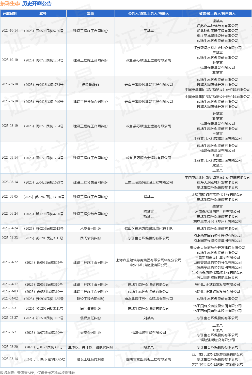 案号:(2025)闽0725民初1254号根据统计,近一年内以东珠生态环保股份有限公司为当事人的历史开庭公告有30则,其中案由为“建设工程施工合同纠纷”的公告以13则居首,其次为“建设工程分包合同纠纷”有3则,“建设工程合同纠纷”有3则。历史开庭公告(前20条)如下: