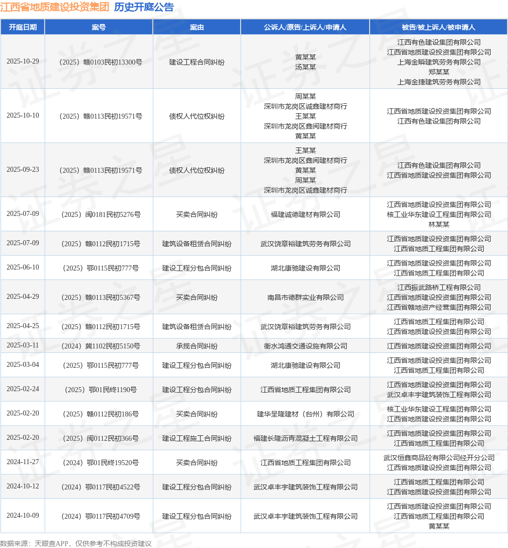 案号:(2025)赣0113民初19571号根据统计,近一年内以江西省地质建设投资集团有限公司为当事人的历史开庭公告有16则,其中案由为“建设工程分包合同纠纷”的公告以5则居首,其次为“买卖合同纠纷”有4则,“债权人代位权纠纷”有2则。历史开庭公告如下: