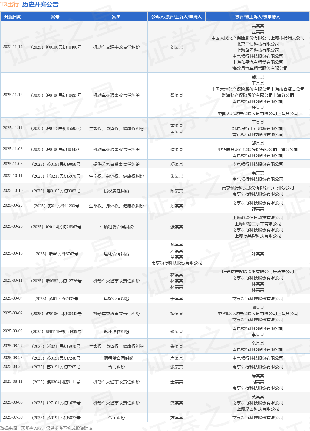 案号:(2025)粤0105民初9382号根据统计,近一年内以南京领行科技股份有限公司为当事人的历史开庭公告有96则,其中案由为“机动车交通事故责任纠纷”的公告以34则居首,其次为“合同纠纷”有19则,“生命权、身体权、健康权纠纷”有8则。历史开庭公告(前20条)如下: