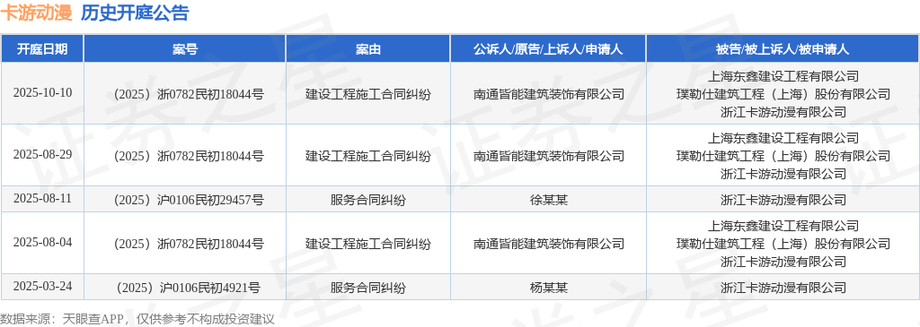 根据统计,近一年内以浙江卡游动漫有限公司为当事人的历史开庭公告有5则,其中案由为“建设工程施工合同纠纷”的公告以3则居首,其次为“服务合同纠纷”有2则。历史开庭公告如下: