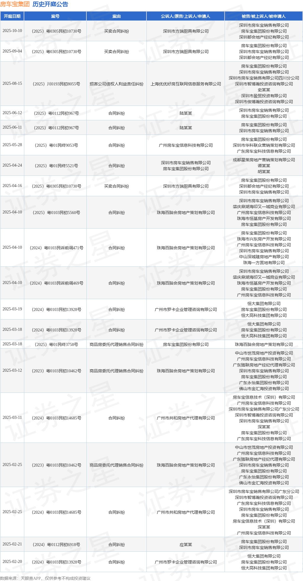 案号:(2025)粤0305民初10730号根据统计,近一年内以房车宝集团股份有限公司为当事人的历史开庭公告有44则,其中案由为“合同纠纷”的公告以25则居首,其次为“商品房委托代理销售合同纠纷”有9则,“买卖合同纠纷”有3则。历史开庭公告(前20条)如下: