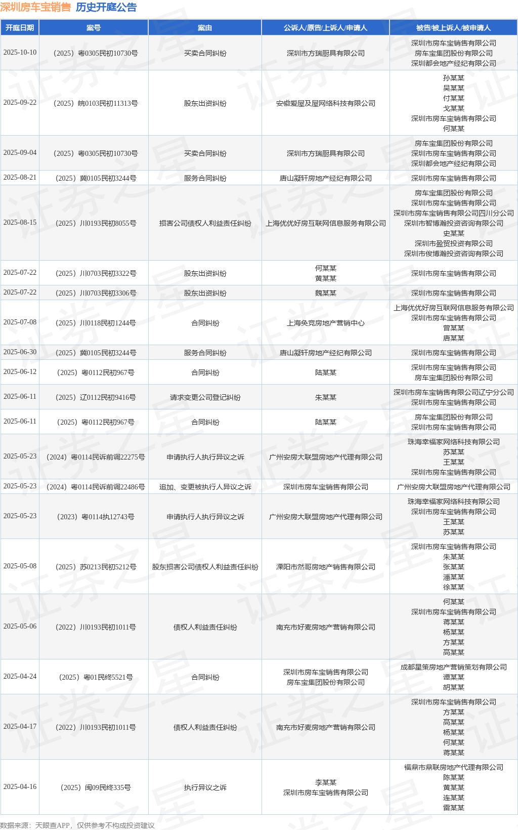 案号:(2025)粤0305民初10730号根据统计,近一年内以深圳市房车宝销售有限公司为当事人的历史开庭公告有62则,其中案由为“合同纠纷”的公告以19则居首,其次为“商品房委托代理销售合同纠纷”有8则,“请求变更公司登记纠纷”有5则。历史开庭公告(前20条)如下: