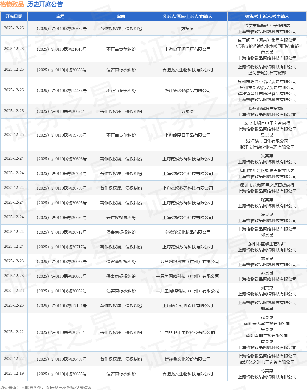 证券之星消息,根据天眼查APP显示,近日公布了一则上海格物致品网络科技有限公司作为被告/被上诉人的开庭公告,详细内容如下: