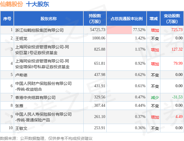 根据仙鹤股份2025年中报公布的十大股东详情如下: