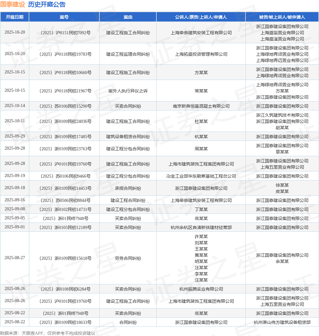 案号:(2025)浙0109民初24036号根据统计,近一年内以浙江国泰建设集团有限公司为当事人的历史开庭公告有158则,其中案由为“建设工程施工合同纠纷”的公告以55则居首,其次为“买卖合同纠纷”有24则,“建设工程分包合同纠纷”有19则。历史开庭公告(前20条)如下: