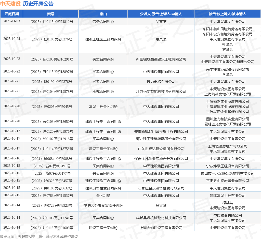 案号:(2025)浙0783民初11982号根据统计,近一年内以中天建设集团有限公司为当事人的历史开庭公告有1734则,其中案由为“买卖合同纠纷”的公告以545则居首,其次为“建设工程施工合同纠纷”有268则,“建设工程分包合同纠纷”有181则。历史开庭公告(前20条)如下: