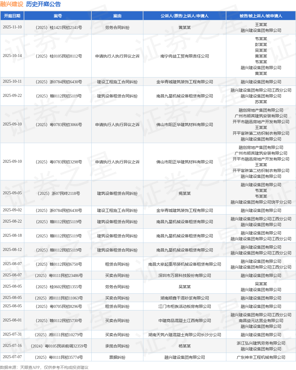 案号:(2025)浙0784民初6430号根据统计,近一年内以融兴建设集团有限公司为当事人的历史开庭公告有78则,其中案由为“买卖合同纠纷”的公告以28则居首,其次为“建筑设备租赁合同纠纷”有11则,“建设工程分包合同纠纷”有11则。历史开庭公告(前20条)如下: