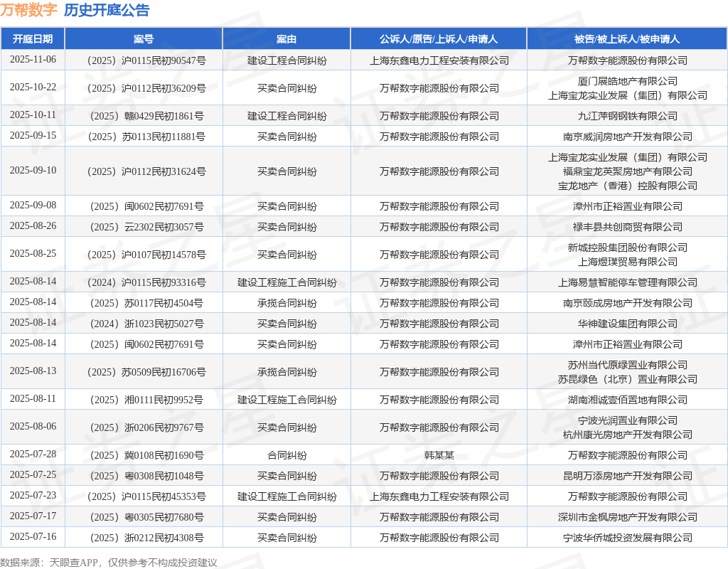 案号:(2025)赣0429民初1861号根据统计,近一年内以万帮数字能源股份有限公司为当事人的历史开庭公告有148则,其中案由为“买卖合同纠纷”的公告以73则居首,其次为“建设工程施工合同纠纷”有25则,“承揽合同纠纷”有19则。历史开庭公告(前20条)如下: