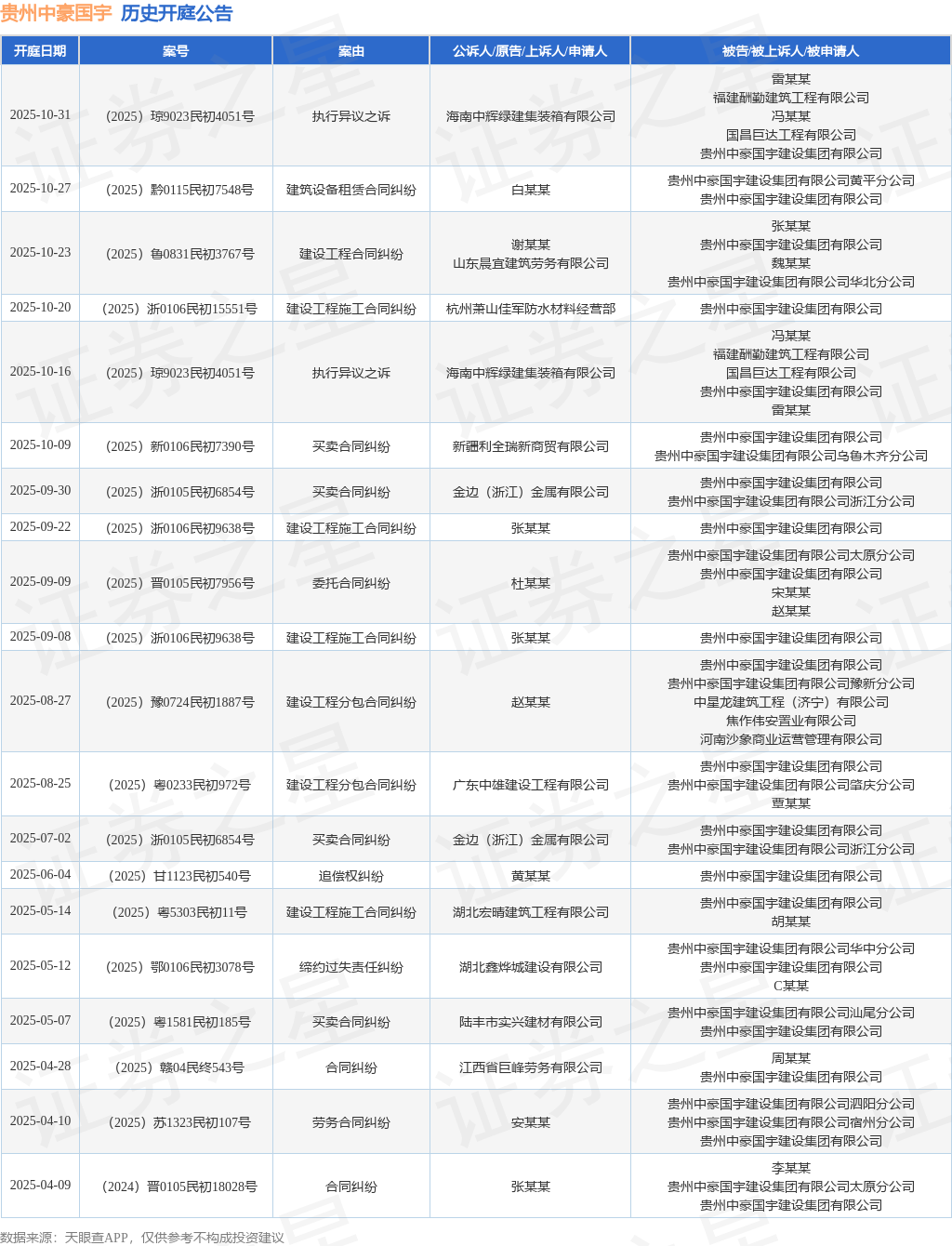 案号:(2025)新0106民初7390号根据统计,近一年内以贵州中豪国宇建设集团有限公司为当事人的历史开庭公告有32则,其中案由为“买卖合同纠纷”的公告以4则居首,其次为“建设工程施工合同纠纷”有4则,“合同纠纷”有3则。历史开庭公告(前20条)如下:
