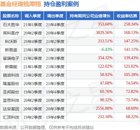 钱厚翔管理的南方大数据100A基金在21年1季度买入石大胜华,在持有3个季度后在21年4季度卖出。持有期间的估算收益率为258.34%,持有期间石大胜华在2020年到2021年的年报归属净利润增幅达353.6%。