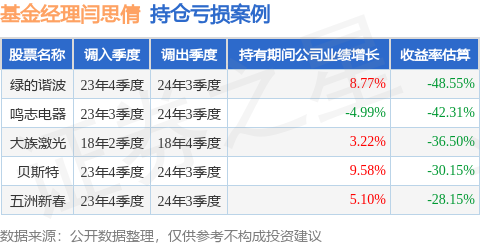 闫思倩管理的鹏华沪深港新兴成长混合A基金在23年4季度买入绿的谐波,在持有3个季度后在24年3季度卖出。持有期间的估算收益率为-48.55%,持有期间绿的谐波在2023年到2024年的年报营业总收入增幅达8.77%。