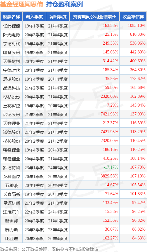 闫思倩管理的工银新能源汽车混合A基金在19年1季度买入亿纬锂能,在持有2年又3个季度后在21年4季度卖出。持有期间的估算收益率为1083.1%,持有期间亿纬锂能在2019年到2021年的年报营业总收入增幅达163.58%。
