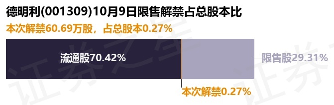 证券之星消息,根据市场公开信息整理,德明利(001309)于10月9日将有60.69万股限售股份解禁,为公司股权激励限售股份,占公司总股本0.27%。(本次数据根据历史公告整理得出,实际情况以上市公司最新公告为准)最近一年内,该股累计解禁3162.0万股,占总股本的13.94%。本次解禁后,公司还有6650.44万股限售股份,占总股本29.31%。具体如下图所示: