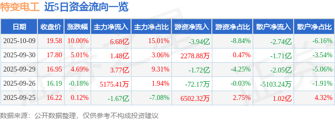 10月9日的资金流向数据方面,主力资金净流入6.68亿元,占总成交额15.01%,游资资金净流出3.94亿元,占总成交额8.84%,散户资金净流出2.74亿元,占总成交额6.16%。