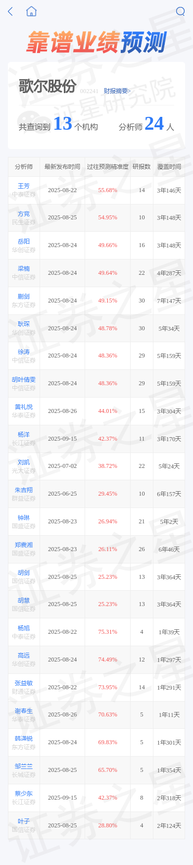 歌尔股份(002241)是基金大佬冯明远的重仓股。,其在整个职业生涯内年化收益高达18.48%。冯明远管理的信澳先进智造股票型A基金在2020年2季度调入歌尔股份,在持有2个季度后在2020年4季度调出,持有期间的估算收益率达到88.67%。(以上数据经过后复权近似计算)冯明远的大佬持仓 - 战绩回顾截图如下: