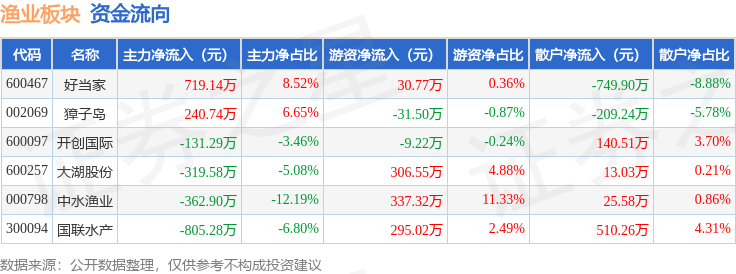 从资金流向上来看,当日渔业板块主力资金净流出659.18万元,游资资金净流入928.93万元,散户资金净流出269.75万元。渔业板块个股资金流向见下表: