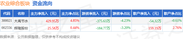 从资金流向上来看,当日农业综合板块主力资金净流入455.53万元,游资资金净流出560.4万元,散户资金净流入104.87万元。农业综合板块个股资金流向见下表:
