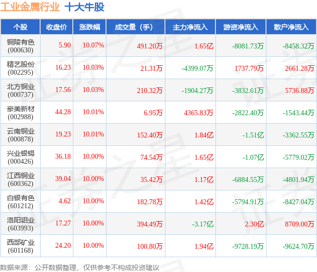 个股表现方面,工业金属行业当日领涨股为铜陵有色(000630),该股当日报收5.9,上涨10.07%,成交量491.2万,主力资金净流入1.65亿元。精艺股份(002295)以上涨10.03%紧随其后,该股当日成交量21.31万,主力资金净流出4399.07万元。除此之外,北方铜业(000737)、豪美新材(002988)、云南铜业(000878)均进入当日牛股之列。具体个股列表见下表: