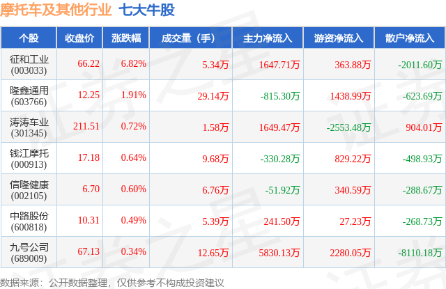 个股表现方面,摩托车及其他行业当日领涨股为征和工业(003033),该股当日报收66.22,上涨6.82%,成交量5.34万,主力资金净流入1647.71万元。隆鑫通用(603766)以上涨1.91%紧随其后,该股当日成交量29.14万,主力资金净流出815.3万元。除此之外,涛涛车业(301345)、钱江摩托(000913)、信隆健康(002105)均进入当日牛股之列。具体个股列表见下表: