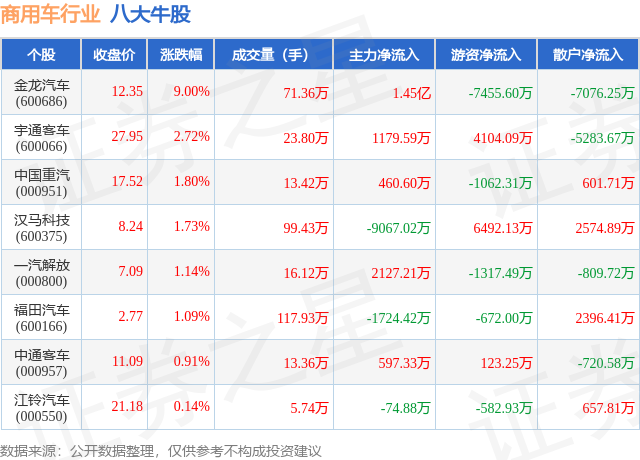个股表现方面,商用车行业当日领涨股为金龙汽车(600686),该股当日报收12.35,上涨9.0%,成交量71.36万,主力资金净流入1.45亿元。宇通客车(600066)以上涨2.72%紧随其后,该股当日成交量23.8万,主力资金净流入1179.59万元。除此之外,中国重汽(000951)、汉马科技(600375)、一汽解放(000800)均进入当日牛股之列。具体个股列表见下表: