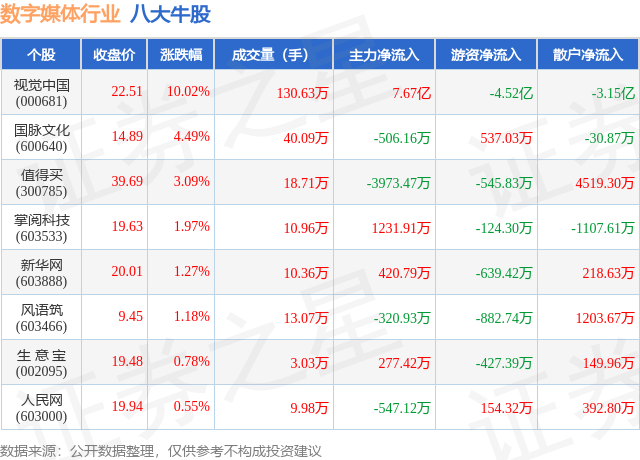 个股表现方面,数字媒体行业当日领涨股为视觉中国(000681),该股当日报收22.51,上涨10.02%,成交量130.63万,主力资金净流入7.67亿元。国脉文化(600640)以上涨4.49%紧随其后,该股当日成交量40.09万,主力资金净流出506.16万元。除此之外,值得买(300785)、掌阅科技(603533)、新华网(603888)均进入当日牛股之列。具体个股列表见下表:
