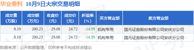 证券之星消息,10月9日华业香料发生大宗交易,交易数据如下:
