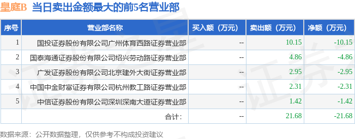 证券之星消息,沪深交易所2025年10月9日公布的交易公开信息显示,皇庭B(200056)因日跌幅偏离值达到7%的前5只证券登上龙虎榜。此次是近5个交易日内第1次上榜。