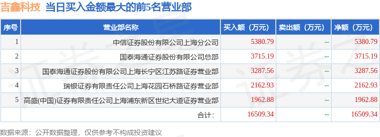 证券之星消息,沪深交易所2025年10月9日公布的交易公开信息显示,吉鑫科技(601218)因有价格涨跌幅限制的日换手率达到20%的前五只证券登上龙虎榜。此次是近5个交易日内第5次上榜。