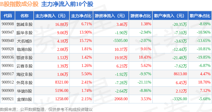 资金流向方面,B股指数(000003)成份股当日主力资金净流出合计165.01万元,游资资金净流出合计303.97万元,散户资金净流入合计468.98万元。成份股资金流向详情见下表: