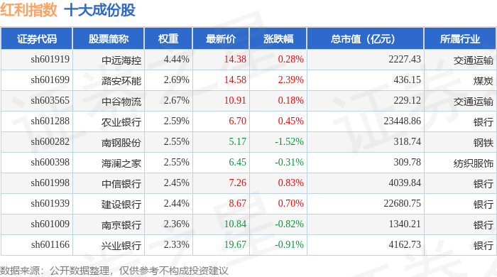 证券之星消息,10月9日,红利指数(000015)报收于2971.88点,涨0.65%,成交335.12亿元,换手率0.34%。当日该指数成份股中,上涨的有29家,开滦股份以4.59%的涨幅领涨,下跌的有18家,渝农商行以2.12%的跌幅领跌。
