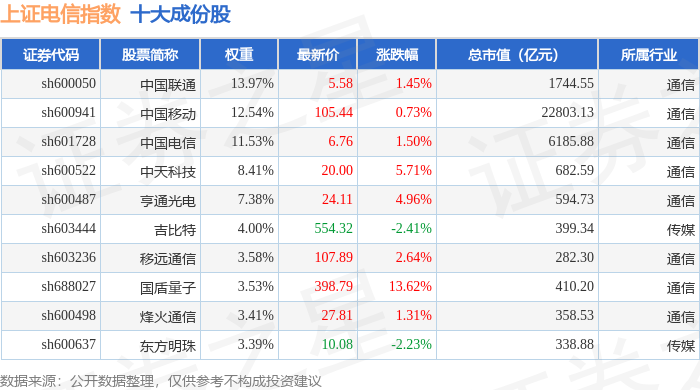 上证电信(000040)指数十大成份股详情如下: