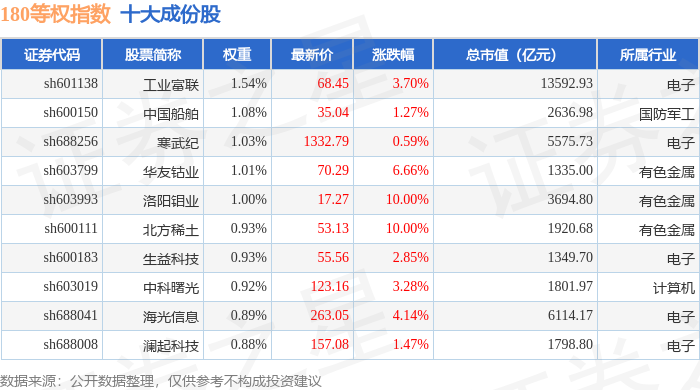 180等权(000051)指数十大成份股详情如下: