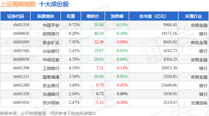 上证周期(000063)指数十大成份股详情如下:
